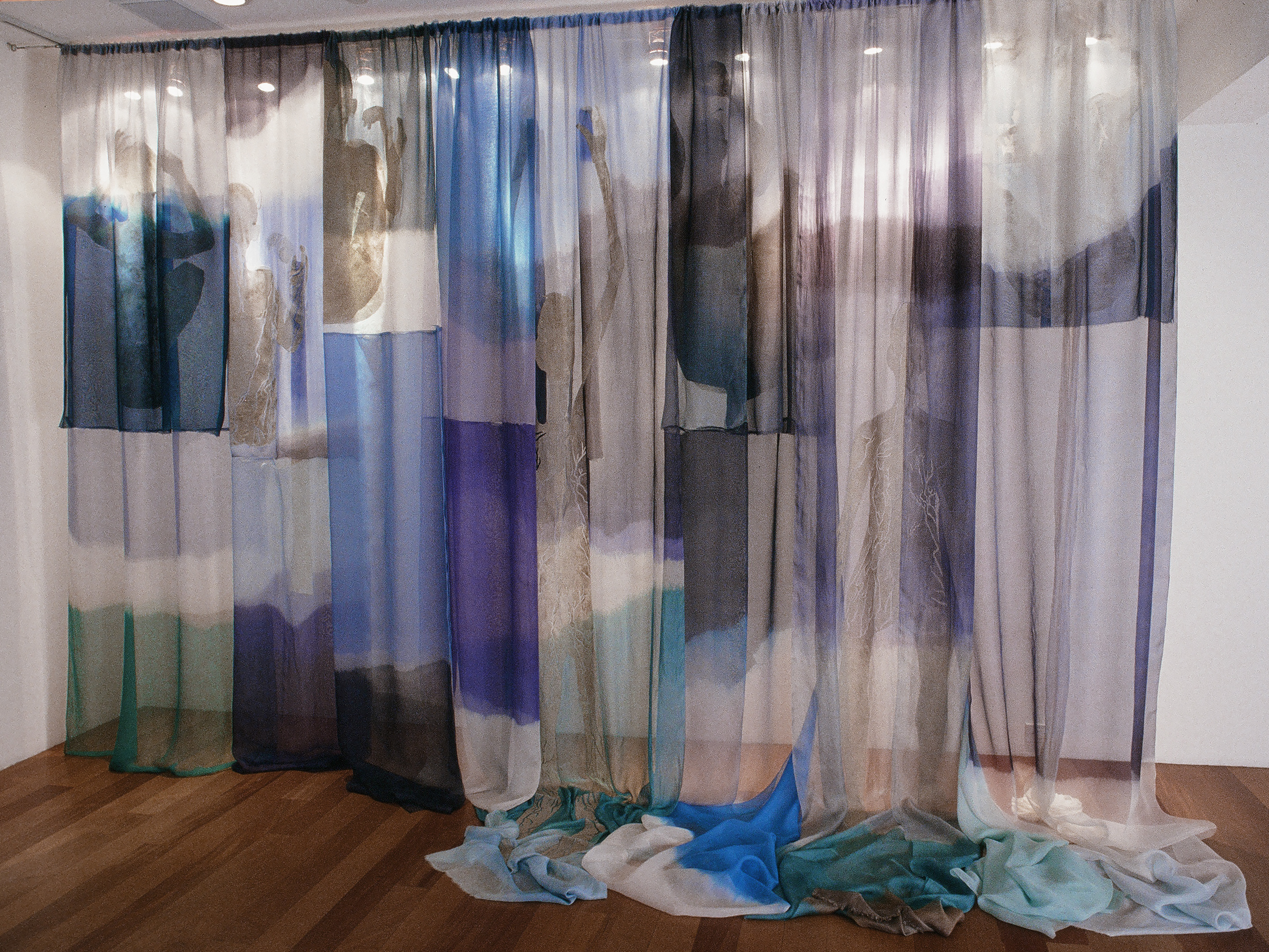 Digital print on plexiglass, charcoal-acrylic-pastel on glassine, metallic thread on silk organza, hand-made papers on glassine