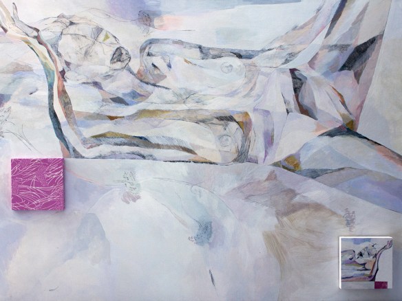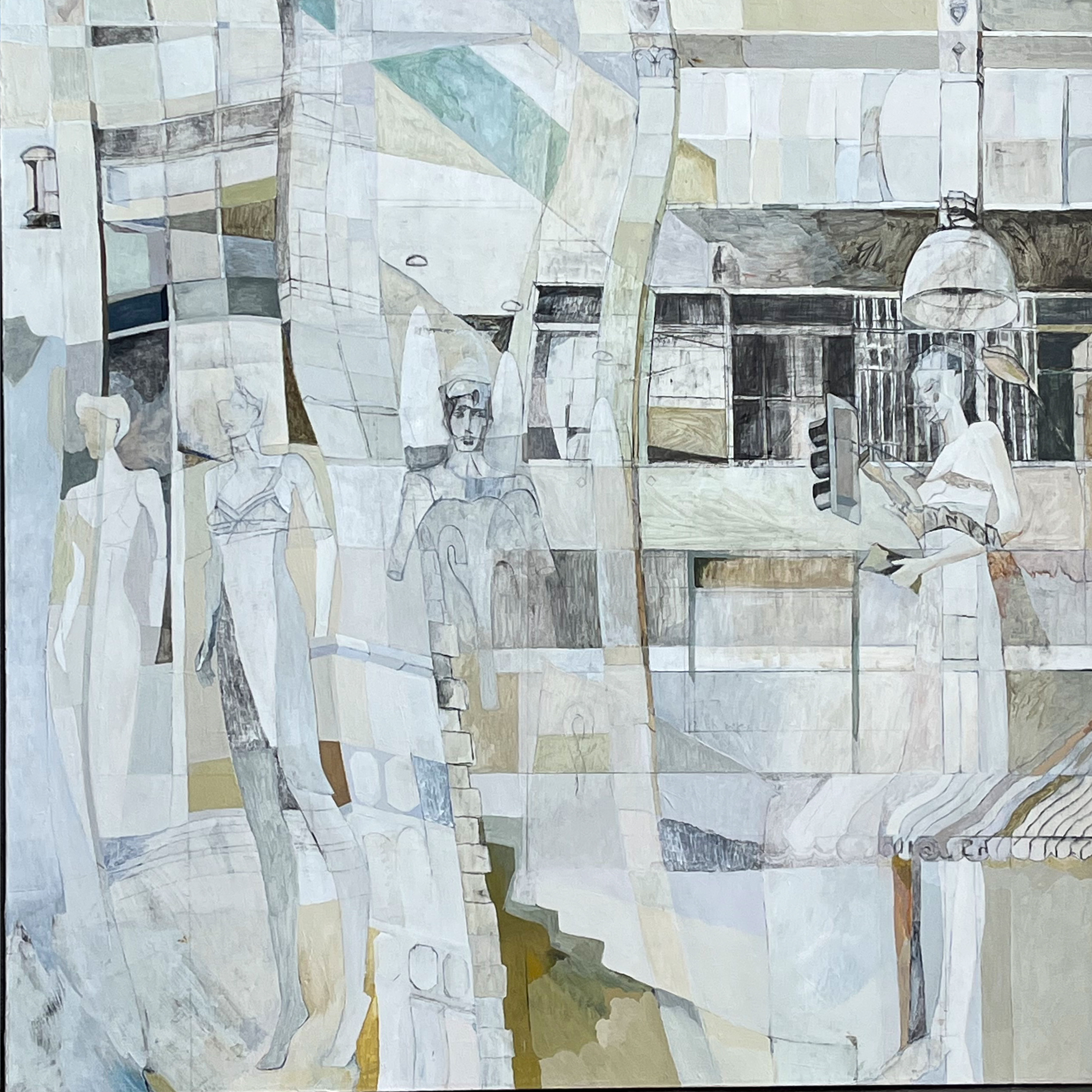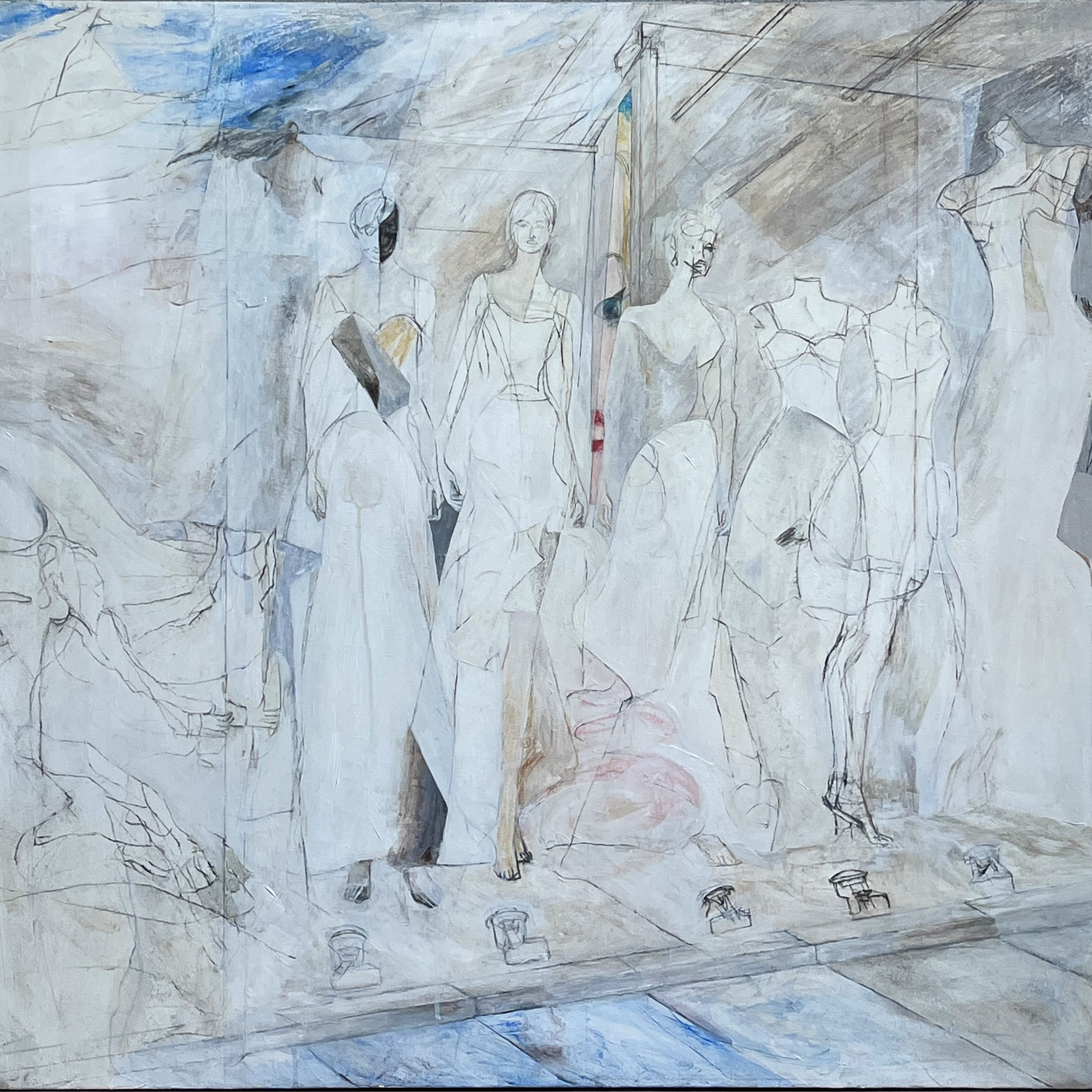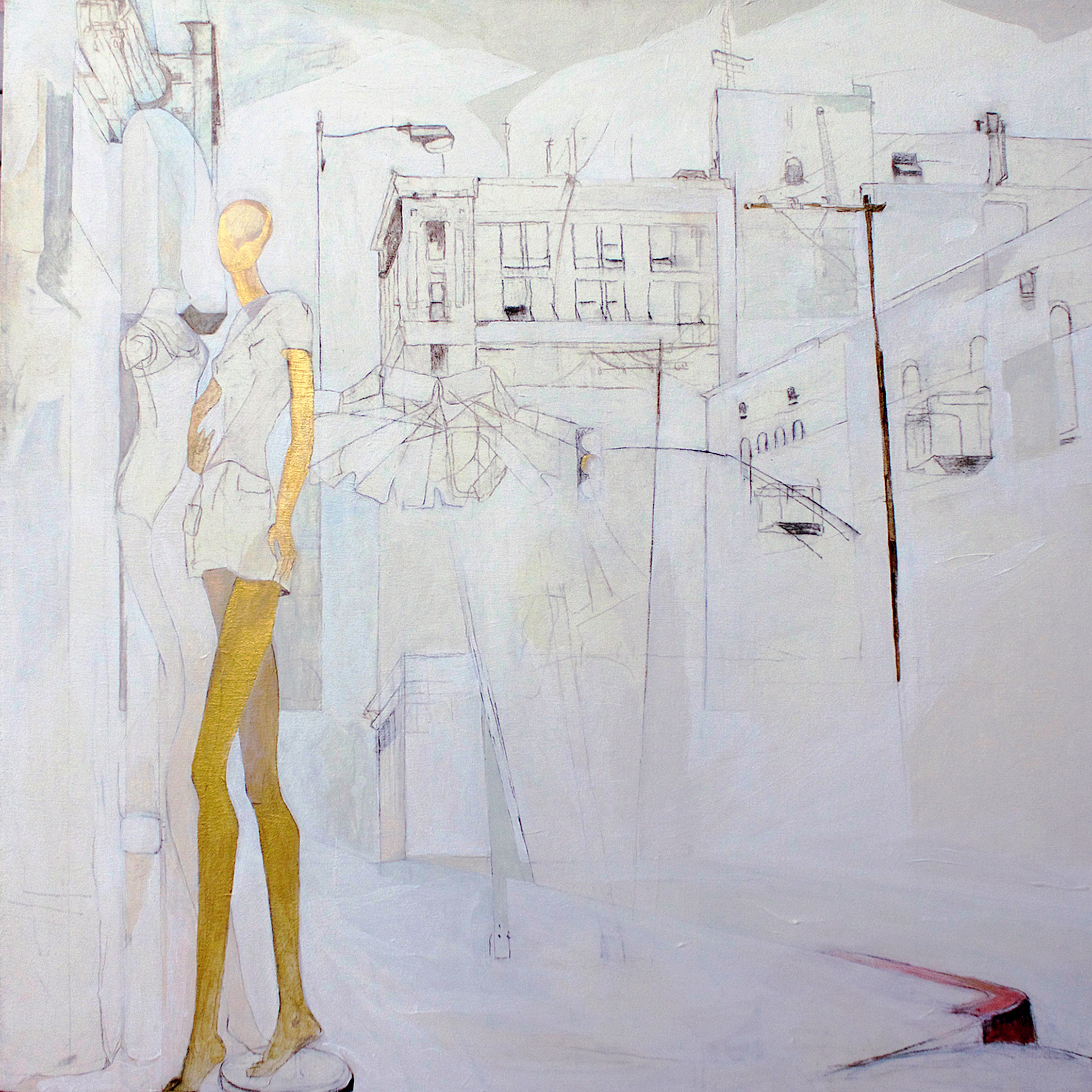 From slaking shadows of bolts of fabric lining Maple Street to Santee Alley emerged this series of mannequins and storefronts through blanched hues and shattered and draped window panes–behind which clothing is cut and sewn. Each painting was initiated on city sidewalks with a canvas in one hand and charcoal on the other and were finished in the studio.